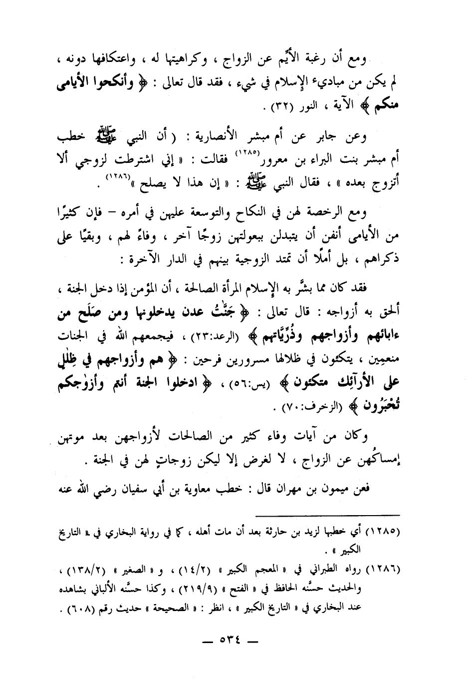ومع أن رغبة الأيم عن الزواج، وكراهيتها له، واعتكافها دونه، لم يكن من مبادئ الإسلام في شيء، فقد قال تعالى: (وأنكحوا الأيامى منكم) الآية، النور (32) .