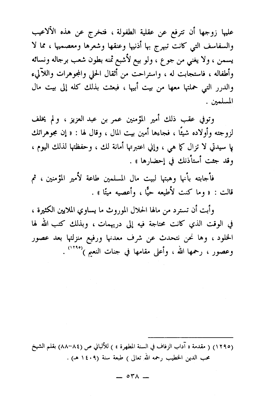 عليها زوجها أن تترفع عن عقلية الطفولة، فتخرج عن هذه الألاعيب والسفاسف التي كانت تبهرج بها أذنيها وعنقها وشعرها ومعصميها، مما لا يسمن، ولا يغني من جوع، ولو بيع لأشبع ثمنه بطون شعب برجاله ونسائه وأطفاله، فاستجابت له، واستراحت من أثقال الحلي والمجوهرات واللآلئ والدرر التي حملتها معها من بيت أبيها، فبعثت بذلك كله إلى بيت مال المسلمين.