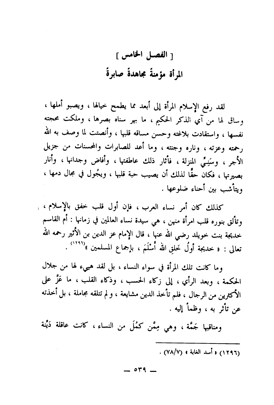 لقد رفع الإسلام المرأة إلى أبعد مما يطمح خيالها، ويصبو أملها،: ساق لها من آي الذكر الحكيم، ما بهر سناه بصرها، وملكت محجته نفسها، واستقادت بلاغته وحسن مساقه قلبها، وأنصتت لما وصف به الله رحمته وعزته، وناره وجنته، وما أعد للصابرات والمحسنات من جزيل الأجر، وسَنِي المنزلة، فأثار ذلك عاطفتها، وأفاض وجدانها، وأنار بصيرتها، فكان حقا لذلك أن يصيب حبة قلبها، ويجُول في مجال دمها، ويتأشب بين أحناء ضلوعها.