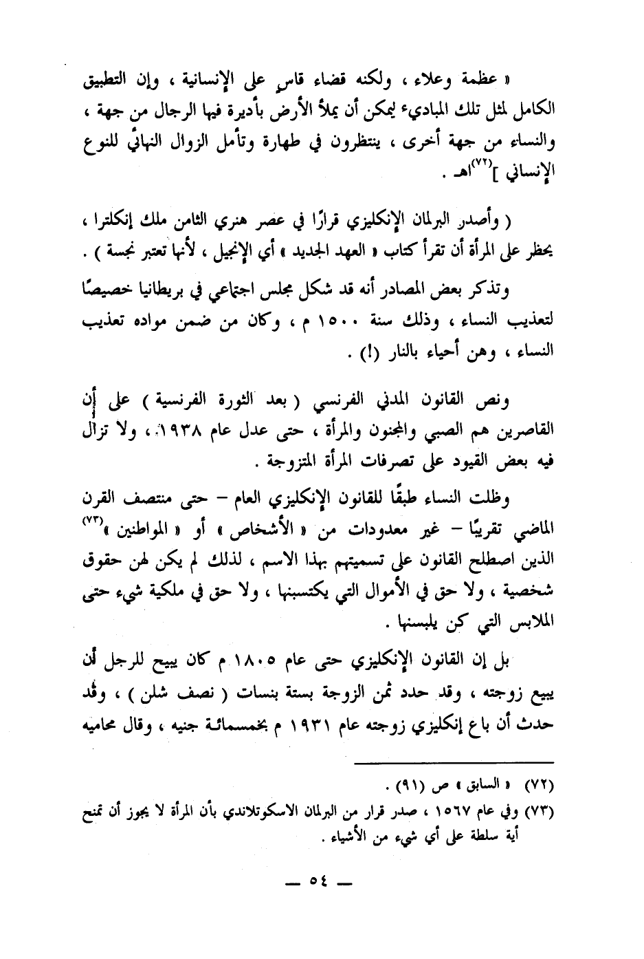 (73) وفي عام 1567، صدر قرار من البرلمان الاسكوتلاندي بأن المرأة لا يجوز أن تمنح أية سلطة على أي شيء من الأشياء.