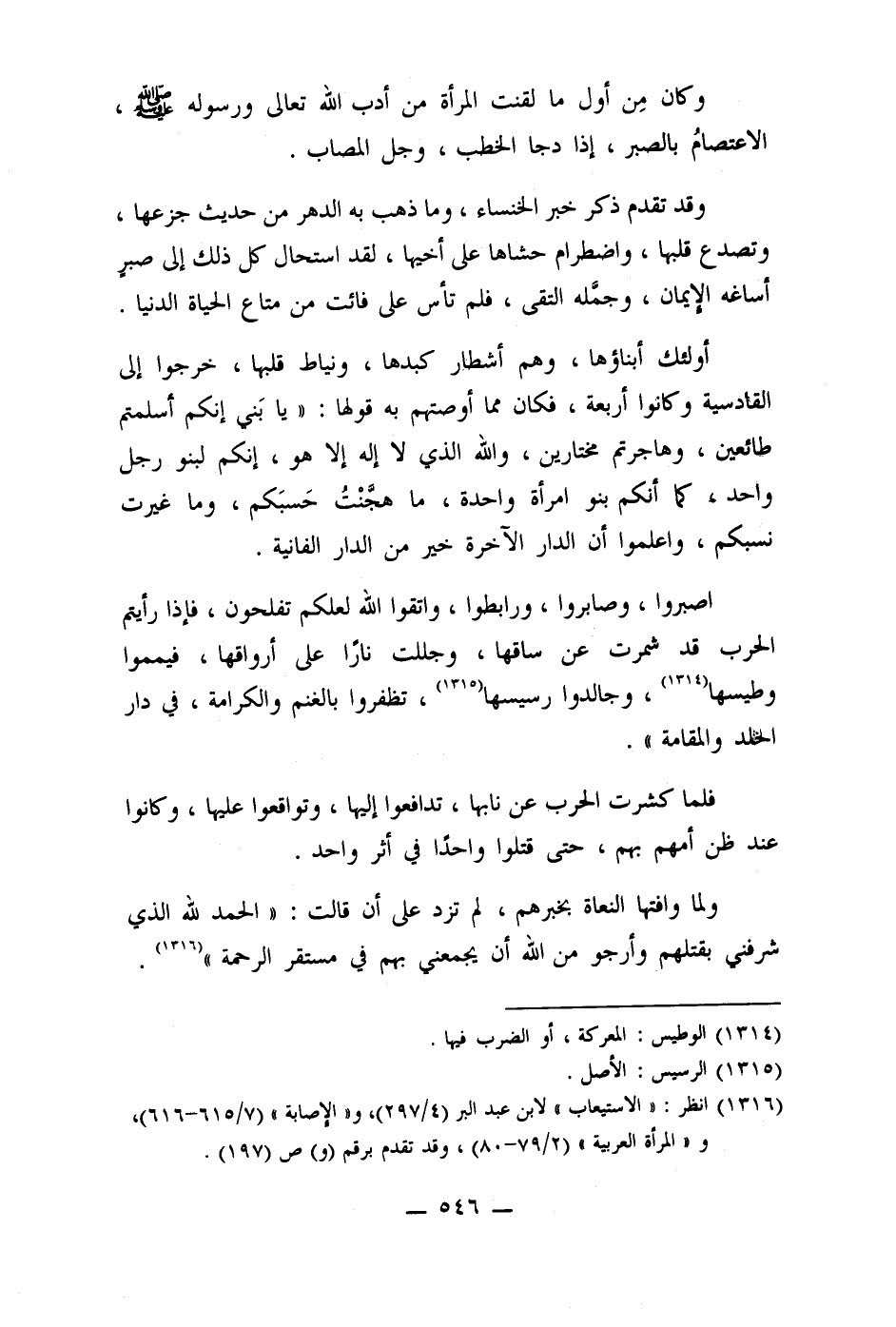 (1316) انظر: " الاستيعاب " لابن عبد البر (4/297) ، و "الإصابة" (7/615-616) ، و " المرأة العربية" (2/79 - 80) ، وقد تقدم برقم (و) ص (197) .