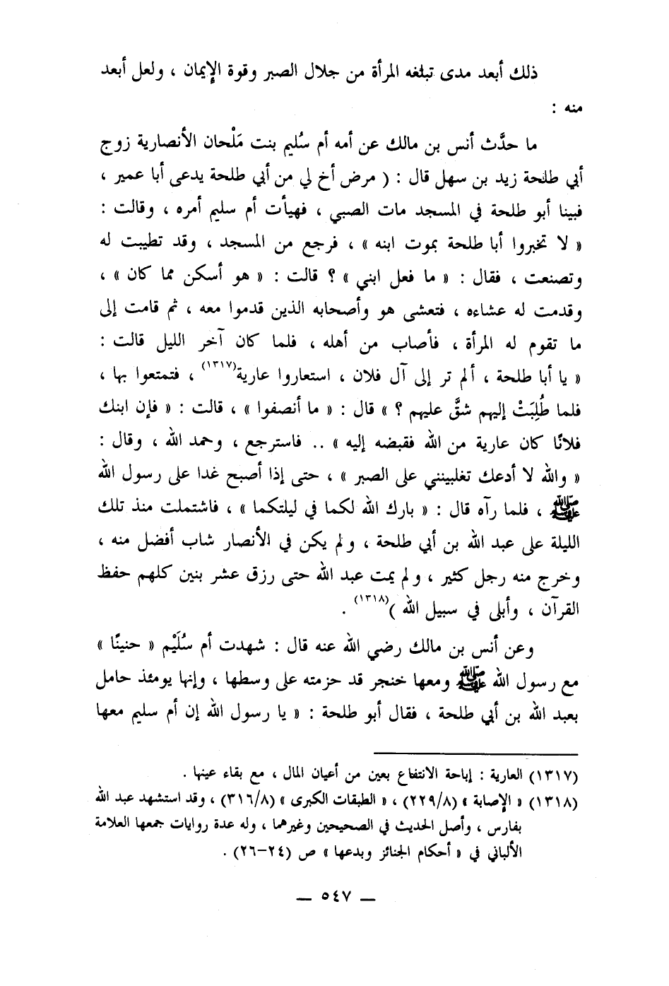 ما حدَّث أنس بن مالك عن أمه أم سُليم بنت مَلْحان الأنصارية زوج أبي طلحة زيد بن سهل قال: (مرض أخ لي من أبي طلحة يدعى أبا عمير، فبينما أبو طلحة في المسجد مات الصبي، فهيأت أم سليم أمره، وقالت: " لا تخبروا أبا طلحة بموت ابنه "، فرجع من المسجد، وقد تطيبت له وتصنعت، فقال: " ما فعل ابني "؟ قالت: " هو أسكن مما كان "، وقدمت له عشاءه، فتعشى هو وأصحابه الذين قدموا معه، ثم قامت إلى ما تقوم له المرأة، فأصاب من أهله، فلما كان آخر الليل قالت: " يا أبا طلحة، ألم تر إلى آل فلان، استعاروا عارية (1317) ، فتمتعوا بها، فلما طُلِبَتْ إليهم شق عليهم؟ " قال: " ما أنصفوا"، قالت: " فإن ابنك فلانا كان عارية من الله فقبضه إليه ".. فاسترجع، وحمد الله، وقال: " والله لا أدعك تغلبينني على الصبر "، حتى إذا أصبح غدا على رسول الله صلى الله عليه وسلم، فلما رآه قال: " بارك الله لكما في ليلتكما"، فاشتملت منذ تلك الليلة على عبد الله بن أبي طلحة، ولم يكن في الأنصار شاب أفضل منه، وخرج منه رجل كثير، ولم يمت عبد الله حتى رزق عشر بنين كلهم حفظ القرآن، وأبلى في سبيل الله) (1318) .