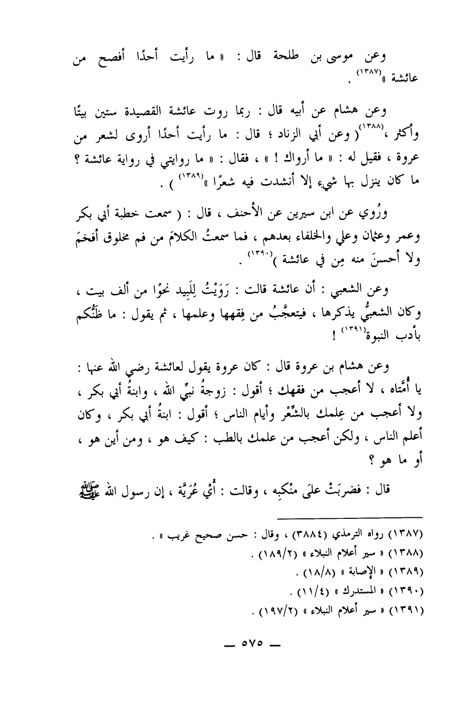 وعن هشام عن أبيه قال: ربما روت عائشة القصيدة ستين بيتًا وأكثر، (1388) (وعن أبي الزناد؛ قال: ما رأيت أحدًا أروى لشعر من عروة، فقيل له: " ما أرواك! "، فقال: " ما روايتي في رواية عائشة؟ ما كان ينزل بها شيء إلا أنشدت فيه شعرًا " (1389)) .