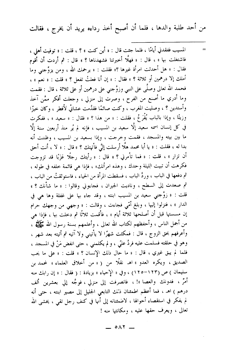 = المسيب ففقدني أيامًا، فلما جئت قال: " أين كنت"؟، قلت: " توفيت أهلي، فاشتغلت بها "، قال: " فهلًا أخبرتنا فشهدناها؟ " قال: ثم أردت أن أقوم فقال: " هل أحدثت امرأة غيرها؟ " فقلت: " يرحمك الله، ومن يزوجني وما أملك إلا درهمين أو ثلاثة؟ " فقال: " إن أنا فعلتُ تفعل؟ " قلت: " نعم"، فحمد الله تعالى وصلى على النبي وزوجني على درهمين أو على ثلاثة، قال: فقمت وما أدري ما أصنع من الفرح، وصرت إلى منزلي، وجعلت أفكر ممن آخذ وأستدين؟، وصليت المغرب، وكنت صائمًا فقدمت عشائي لأفطر، وكان خبزًا وزيتًا، وإذا بالباب يُقْرعُ، فقلت: " من هذا؟ " فقال: " سعيد"، ففكرت في كل إنسان اسمه سعيد إلًا سعيد بن المسيب، فإنه لم يُر منذ أربعين سنة إلا ما بين بيته والمسجد، فقمت وِخرجت، إذا بسعيد بن المسيب، وظننت أنه بدا له، فقلت: " يا أبا محمد هَلا أرسلت إلي فأتيتك؟ " قال: " لا، أنت أحق أن تزار"، قلت: " فما تأمرني؟ " قال: " رأيتك رجلًا عَزَبًا قد تزوجت فكرهت أن تبيت الليلة وحدك، وهذه امرأتك "، فإذا هي قائمة خلفه فِي طوله، ثم دفعها في الباب، ورد الباب، فسقطت المرأة من الحياء، فاستوثقتُ من الباب، ثم صعدت إلى السطح، وناديت الجيران، فجاءوني وقالوا: " ما شأنك؟ " قلت: " زؤَجني سعيد بن المسيب ابنته، وقد جاء بها على غفلة وها هي في الدار"، فنزلوا إليها، وبلغ أمي فجاءت، وقالت: " وجهي من وجهك حرام إن مسستها قبل أنا أصلحها ثلاثة أيام "، فأقمت ثلاثًا ثم دخلت بها، فإذا هي من أجمل الناس، وأحفظهم لكتاب الله تعالى، وأعلمهم بسنة رسول الله صلى الله عليه وسلم، وأعرفهم بحق الزوج، قال: فمكثت شهرا لا يأتيني ولا آتيه ثم أتيته بعد شهر، وهو في حلقته فسلمت عليه فرد علي، ولم يكلمني، حتى انفض مَنْ في المسجد، فلما لم يبق غيري، قال: " ما حال ذلك الإنسان؟ " قلت: " على ما يحب الصديق، ويكره العدو " اهـ نقلًا من (" من أخلاق العلماء" لمحمد بن سليمان) ص (123-125) ، وفي " الإحياء" بزيادة: (فقال: " إن رابك منه أمرً، فدونك والعصا "! ، فانصرفت إلى منزلي، فوجه إلي بعشرين ألف درهم) اهـ، فما أعظم اطمئنان ذلك التابعي الجليل إلى مصير ابنته، حتى أنه لم يفكر في استقصاء أحوالها، لاطمئنانه إلى أنها في كنف رجل تقي، يخشى الله تعالى، ويعرف حقها عليه، ومكانتها منه!