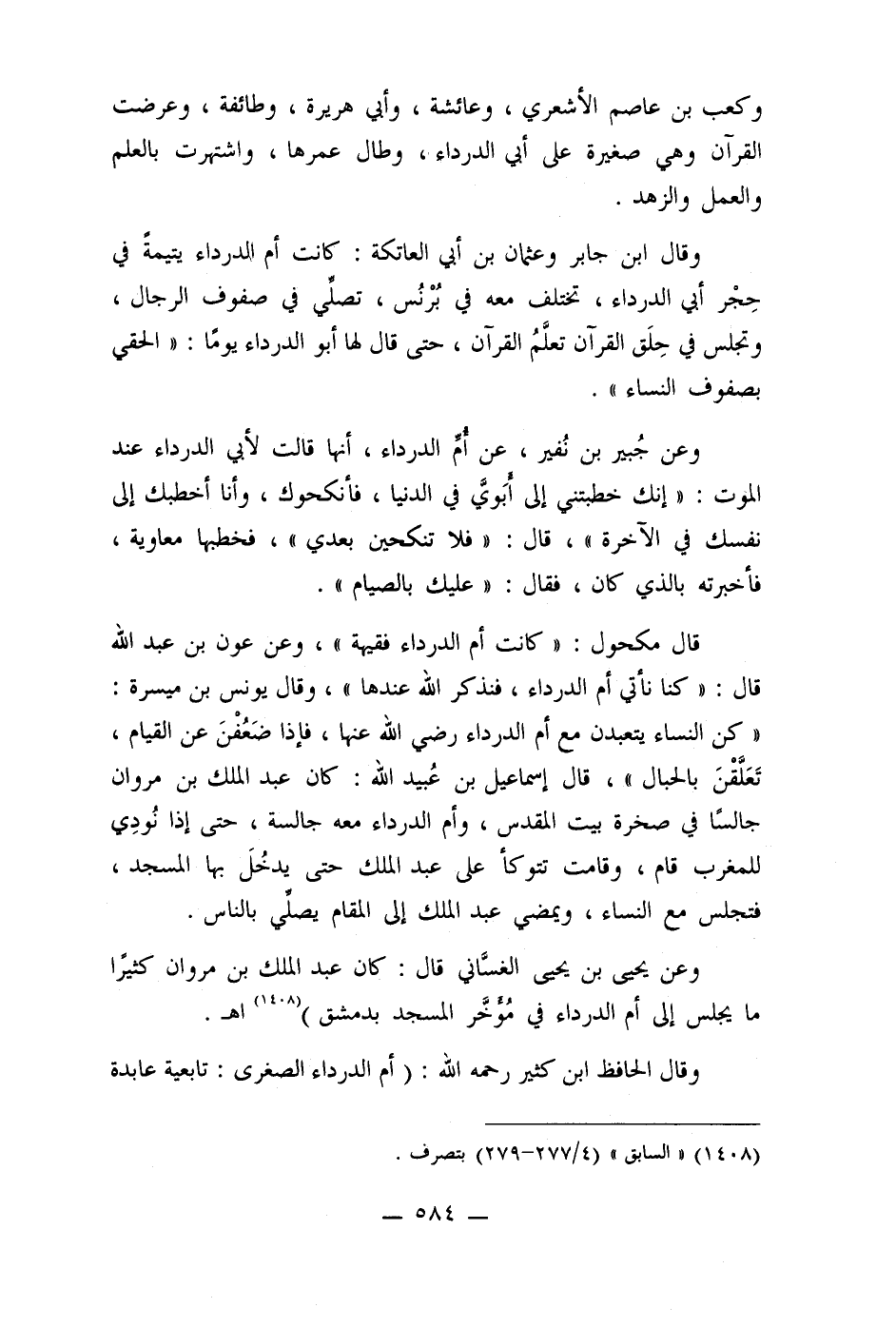 وعن يحيى بن يحيى الغسَّاني قال: كان عبد الملك بن مروان كثيرًا ما يجلس إلى أم الدرداء في مُؤخَر المسجد بدمشق) (1408) اهـ.