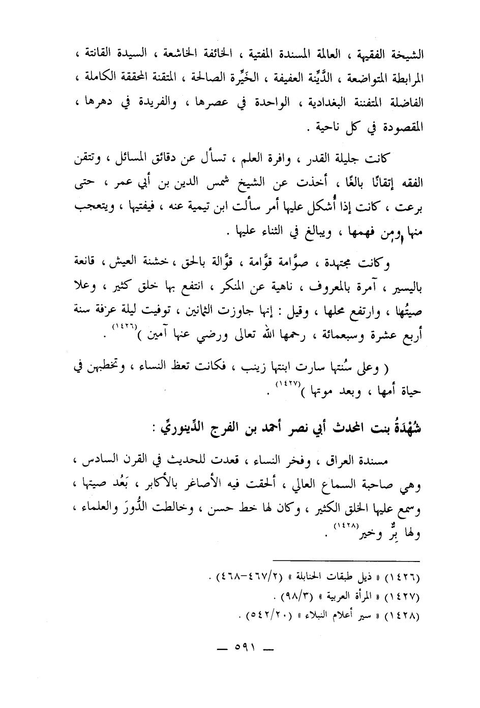 الشيخة الفقيهة، العالمة المسندة المفتية، الخائفة الخاشعة، السيدة القانتة، المرابطة المتواضعة، الدَّينة العفيفة، الخَيِّرة الصالحة، المتقنة المحققة الكاملة، الفاضلة المتفننة البغدادية، الواحدة في عصرها، والفريدة في دهرها، المقصودة في كل ناحية.