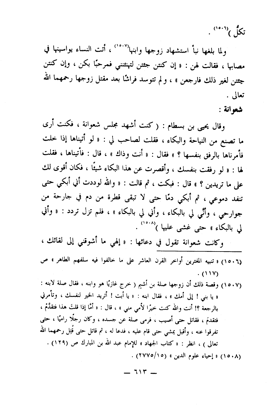 (1507) وقصة ذلك أن زوجها صلة بن أشيم (خرج غازيا هو وابنه، فقال صله لابنه: " يا بني! إلى أمك "، فقال ابنه: " يا أبت! أتريد الخير لنفسك، وتأمرني بالرجعة؟! أنت والله كنت خيرًا لأمي مني"، قال: " أما إذا قلتَ هذا فتقدَّمْ، فتقدم، فقاتل حتى أصيب، فرمى صلة عن جسده، وكان رجلًا راميا، حتى تفرقوا عنه، وأقبل يمشي حتى قام عليه، فدعا له، ثم قاتل حتى قتِل رحمهما الله تعالى) ، انظر: " كتاب الجهاد" للإمام عبد الله بن المبارك ص (129) .