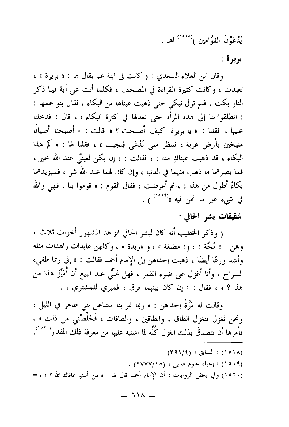 (وذكر الخطيب أنه كان لبشر الحافي الزاهد المشهور أخوات ثلاث، وهن: " مُخًة"، و " مضغة "، و "زبدة"، وكلهن عابدات زاهدات مثله وأشد ورعًا أيضًا، ذهبت إحداهن إلى الإمام أحمد فقالت: " إني ربما طفئ السراج، وأنا أغزل على ضوء القمر، فهل عَلَيَّ عند البيع أن أمَيز هذا من هذا؟ "، فقال: " إن كان بينهما فرق، فميزي للمشتري ".
