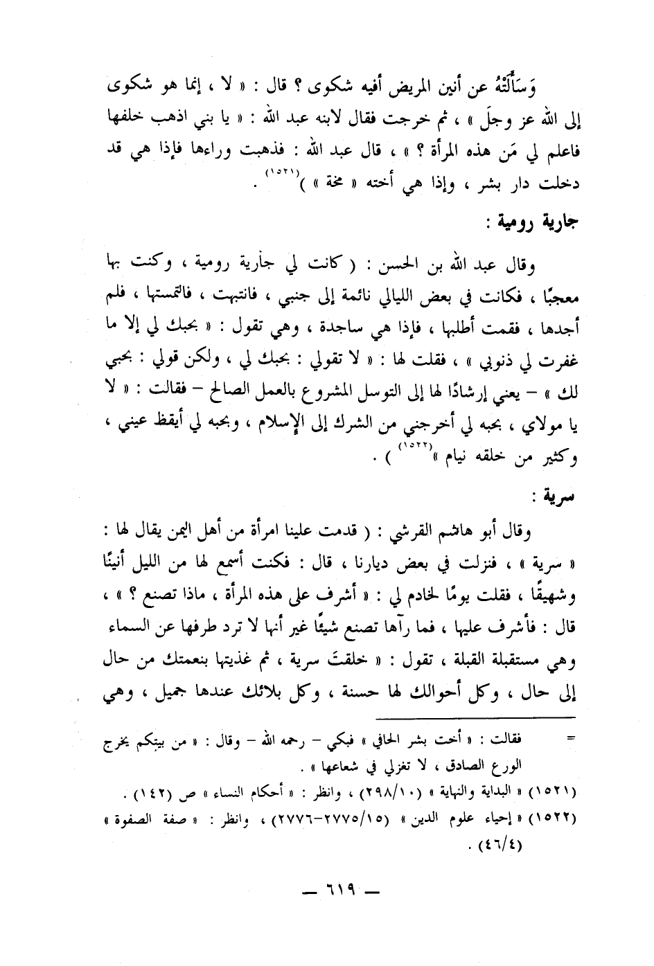 وقال عبد الله بن الحسن: (كانت لي جارية رومية، وكنت بها معجبًا، فكانت في بعض الليالي نائمة إلى جنبي، فانتبهت، فالتمستها، فلم أجدها، فقمت أطلبها، فإذا هي ساجدة، وهي تقول: " بحبك في إلا ما غفرت لي ذنوبي"، فقلت لها: " لا تقولي: بحبك لي، ولكن قولي: بحبي لك "- يعني إرشادًا لها إلى التوسل المشروع بالعمل الصالح- فقالت: " لا يا مولاي، بحبه لي أخرجني من الشرك إلى الإسلام، وبحبه لي أيقظ عيني، وكثير من خلقه نيام " (1522)) .