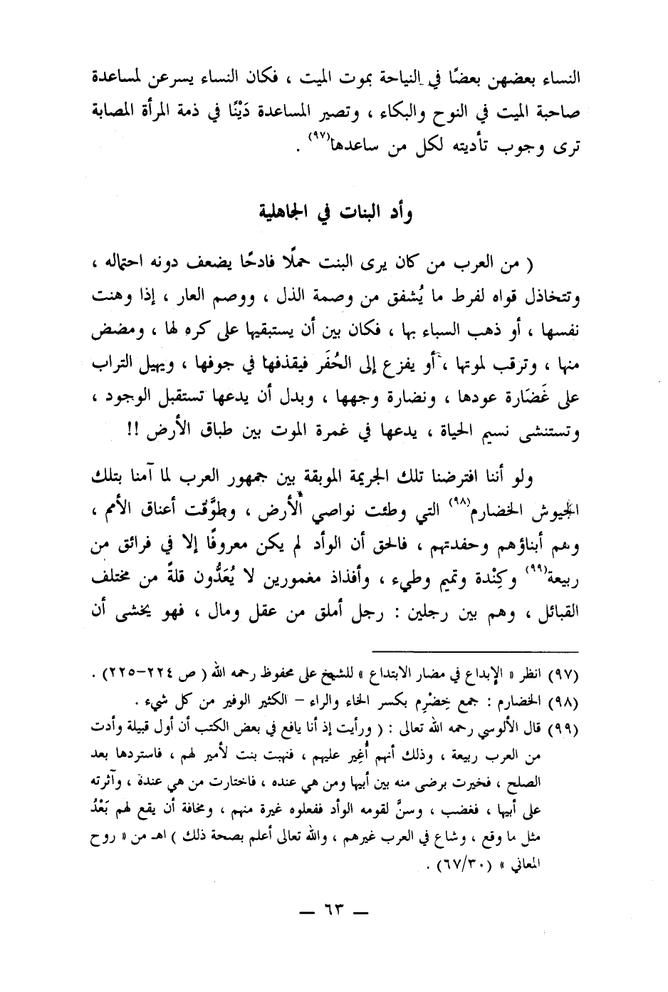 (من العرب من كان يرى البنت حملَا فادحًا يضعف دونه احتماله، وتتخاذل قواه لفرط ما يُشفق من وصمة الذل، ووصم العار، إذا وهنت نفسها، أو ذهب السباء بها، فكان بين أن يستبقيها على كره لها، ومضض منها، وترقب لموتها، أو يفزع إلى الحُفَر فيقذفها في جوفها، ويهيل التراب على غَضَارة عودها، ونضارة وجهها، وبدل أن يدعها تستقبل الوجود، وتستنشي نسيم الحياة، يدعها في غمرة الموت بين طباق الأرض!!