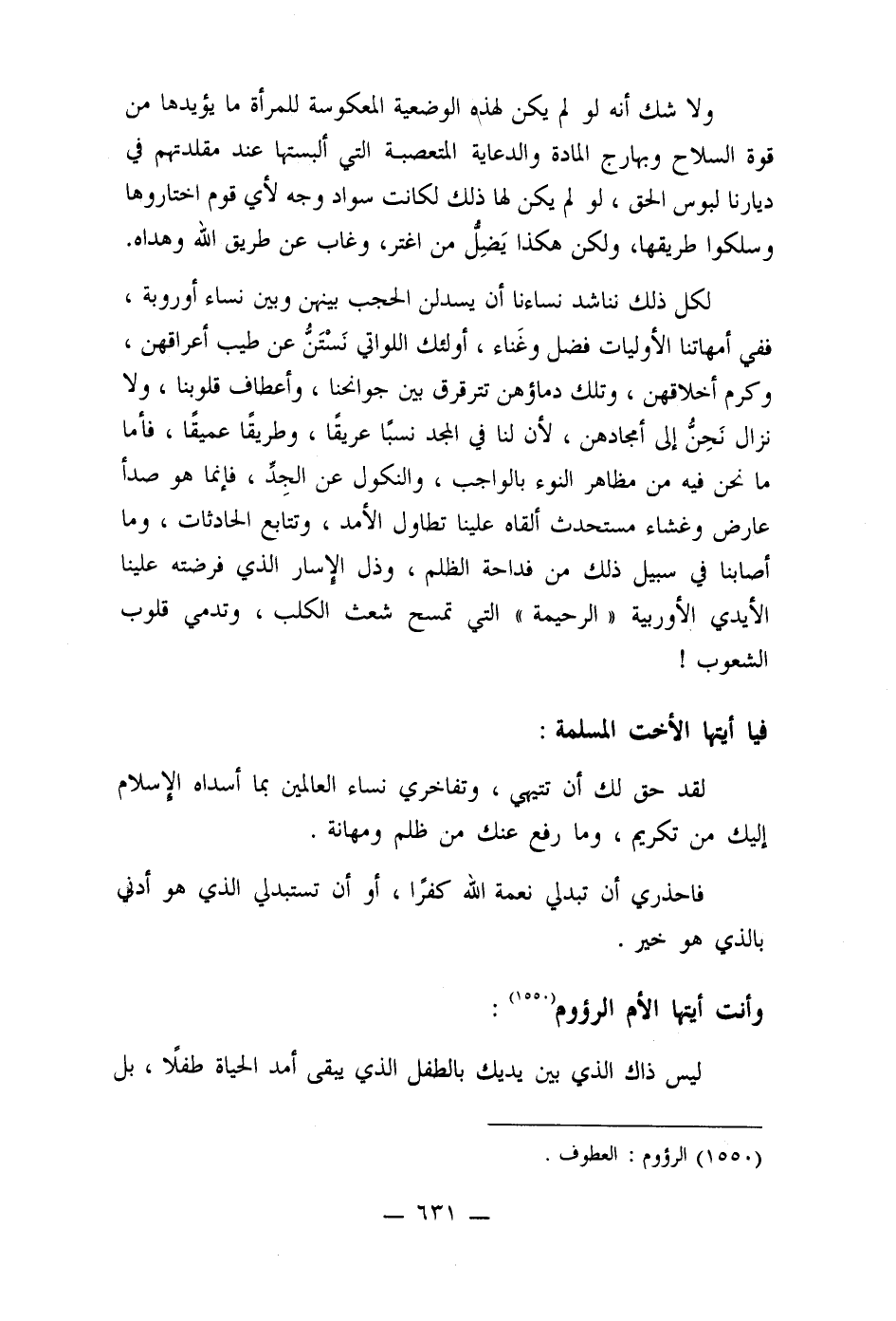 لكل ذلك نناشد نساءنا أن يسدلن الحجب بينهن وبين نساء أوروبة، ففي أمهاتنا الأوليات فضل وغَناء، أولئك اللواتي نَسْتَن عن طيب أعراقهن، وكرم أخلاقهن، وتلك دماؤهن تترقرق بين جوانحنا، وأعطاف قلوبنا، ولا نزال نَحِن إلى أمجادهن، لأن لنا في المجد نسبا عريقًا، وطريقًا عميقًا، فأما ما نحن فيه من مظاهر النوء بالواجب، والنكول عن الجِدّ، فإنما هو صدأ عارض وغشاء مستحدث ألقاه علينا تطاول الأمد، وتتابع الحادثات، وما أصابنا في سبيل ذلك من فداحة الظلم، وذل الإسار الذي فرضته علينا الأيدي الأوربية " الرحيمة" التي تمسح شعث الكلب، وتدمي قلوب الشعوب!