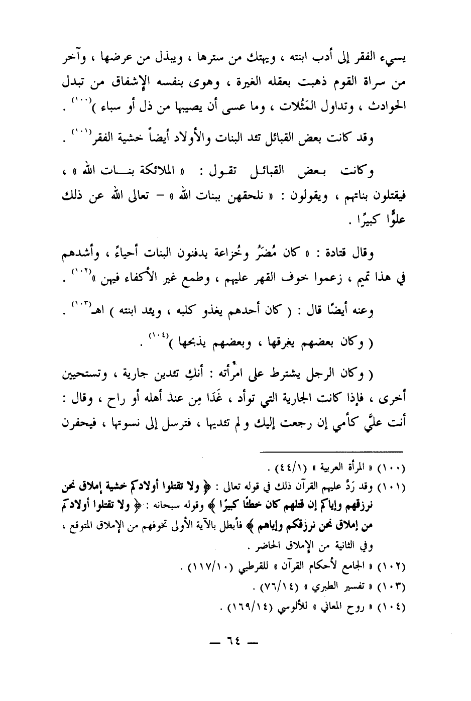 وقد كانت بعض القبائل تئد البنات والأولاد أيضاً خشية الفقر (101) .