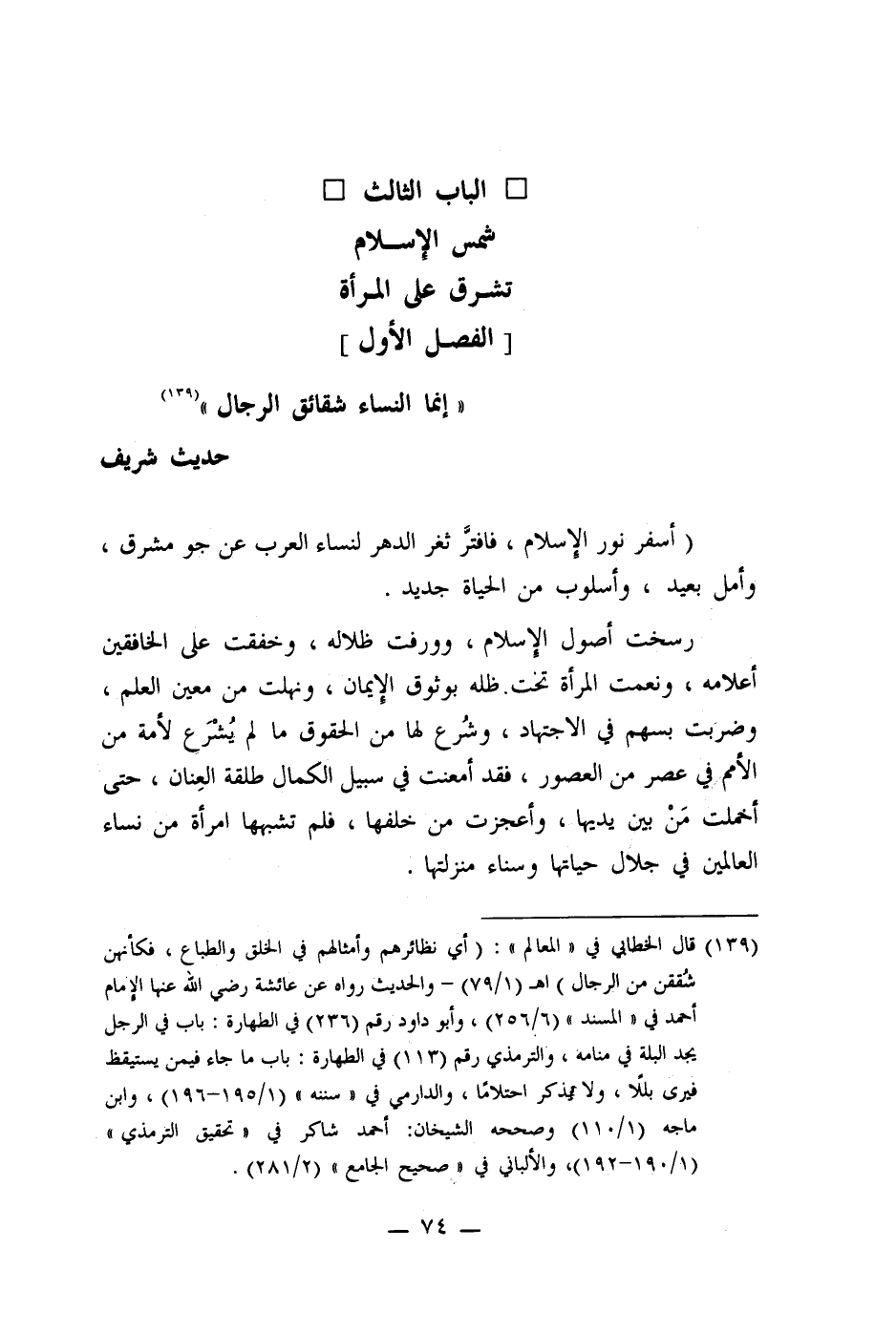 (أسفر نور الإسلام، فافترَّ ثغر الدهر لنساء العرب عن جو مشرق، وأمل بعيد، وأسلوب من الحياة جديد.