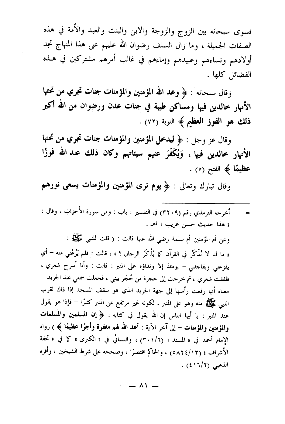 فسوى سبحانه بين الزوج والزوجة والابن والبنت والعبد والأمة في هذه الصفات الجميلة، وما زال السلف رضوان الله عليهم على هذا المنهاج تجد أولادهم ونساءهم وعبيدهم وإماءهم في غالب أمرهم مشتركين في هذه الفضائل كلها.