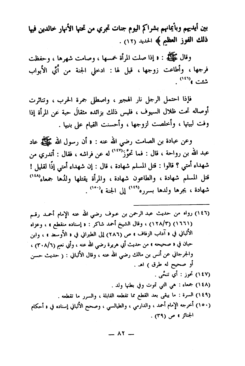 وعن عبادة بن الصامت رضي الله عنه: " أن رسول الله صلى الله عليه وسلم عاد عبد الله بن رواحة، قال: فما تحوز (147) له عن فراشه، فقال: أتدري من شهداء أمتي؟ قالوا: قتل المسلم شهادة، قال: إن شهداء أمتي إذا لقليل قتل المسلم شهادة، والطاعون شهادة، والمرأة يقتلها ولدُها جمعاء (148) شهادة، يجرها ولدها بسرره (149) إِلى الجنة، (150) .