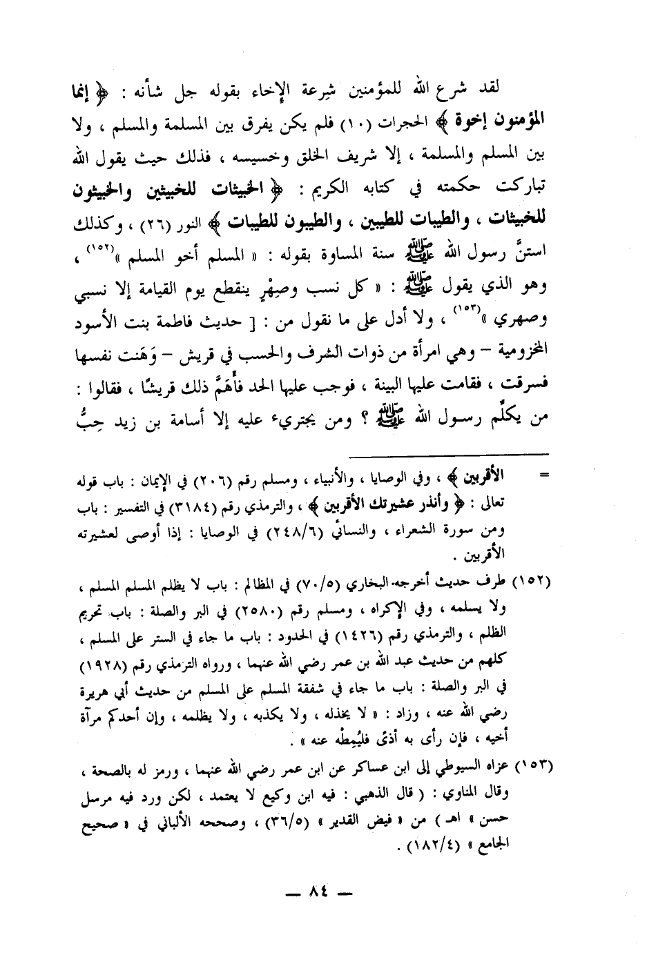 لقد شرع الله للمؤمنين شِرعة الإخاء بقوله جل شأنه: (إنما المؤمنون إخوة) الحجرات (10) فلم يكن يفرق بين المسلمة والمسلم، ولا بين المسلم والمسلمة، إلا شريف الخلق وخسيسه، فذلك حيث يقول الله تباركت حكمته في كتابه الكريم: (الخبيثات للخبيثين والخبيثون للخبيثات، والطيبات للطيبين، والطيبون للطيبات) النور (26) ، وكذلك استن رسول الله صلى الله عليه وسلم سنة المساواة بقوله: "المسلم أخو المسلم" (152) ، وهو الذي يقول صلى الله عليه وسلم: (كل نسب وصِهْرٍ ينقطع يوم القيامة إلا نسبي وصهري" (153) ، ولا أدل على ما نقول من: [حديث فاطمة بنت الأسود المخزومية - وهي امرأة من ذوات الشرف والحسب في قريش - وَهَنت نفسها فسرقت، فقامت عليها البينة، فوجب عليها الحد فأَهَمَّ ذلك قريشًا، فقالوا: من يكلِّم رسول الله صلى الله عليه وسلم؟ ومن يجترئ عليه إلا أسامة بن زيد حِبُّ