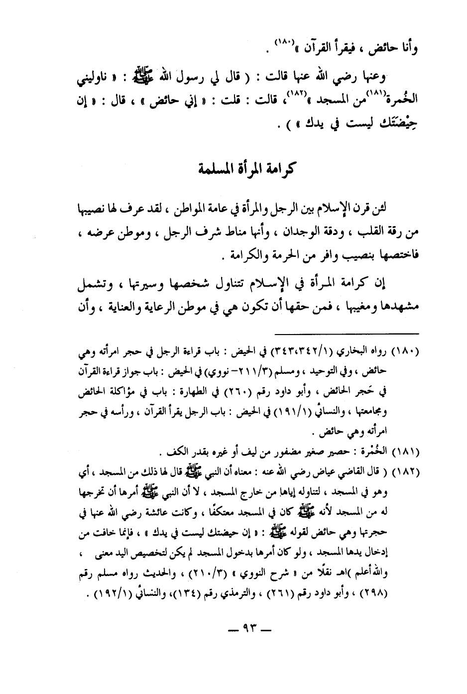 (180) رواه البخاري (1/342، 343) في الحيض: باب قراءة الرجل في حجر امرأته وهي حائض، وفي التوحيد، ومسلم (3/211- نووي) في الحيض: باب جواز قراءة القرآن في حَجر الحائض، وأبو داود رقم (260) في الطهارة: باب في مؤاكلة الحائض ومجامعتها، والنسائي (1/191) في الحيض: باب الرجل يقرأ القرآن، ورأسه في حجر امرأته وهي حائض.