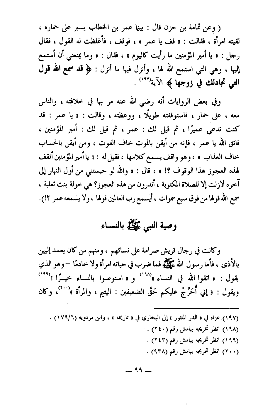 (وعن ثمامة بن حزن قال: بينما عمر بن الخطاب يسير على حماره، لقيته امرأة، فقالت: " قف يا عمر"، فوقف، فأغلظت له القول، فقال رجل: " يا أمير المؤمنين ما رأيت كاليوم"، فقال: "وما يمنعني أن أستمع إليها، وهي التي استمع الله لها، وأنزل فيها ما أنزل: (قد سمع الله قول التي تجادلك في زوجها) الآية (197) .