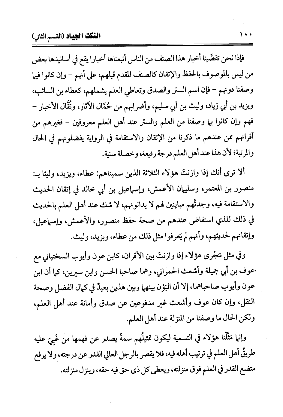 ألا ترى أنك إذا وازنتَ هؤلاء الثلاثة الذين سميناهم: عطاء، ويزيد، وليثا بـ: منصور بن المعتمر، وسليمان الأعمش، وإسماعيل بن أبي خالد في إتقان الحديث والاستقامة فيه، وجدتَّهم مباينين لهم لا يدانونهم، لا شك عند أهل العلم بالحديث في ذلك للذي استفاض عندهم من صحة حفظ منصور، والأعمش، وإسماعيل، وإتقانهم لحديثهم، وأنهم لم يَعرفوا مثل ذلك من عطاء، ويزيد، وليث.
