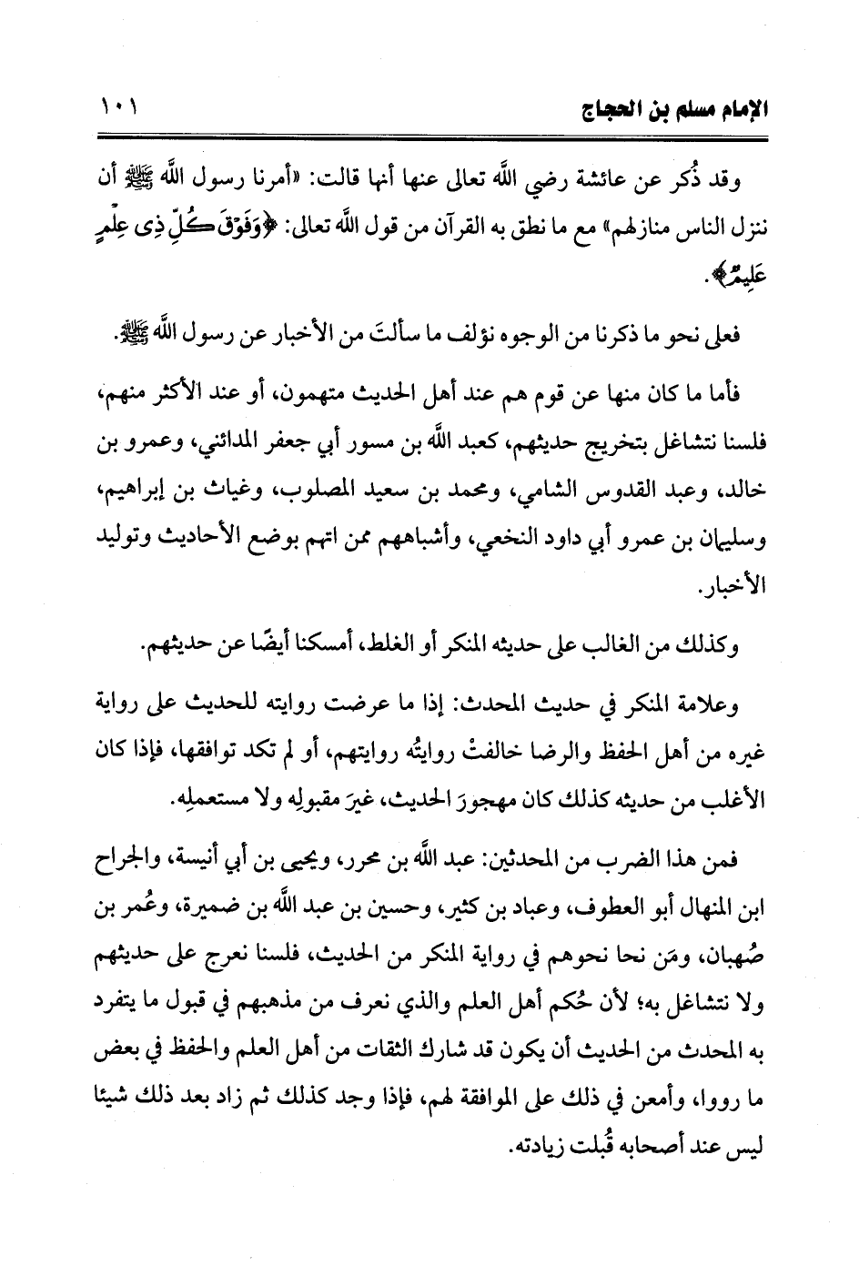 فمن هذا الضرب من المحدثين: عبد الله بن محرر، ويحيى بن أبي أنيسة، والجراح ابن المنهال أبو العطوف، وعباد بن كثير، وحسين بن عبد الله بن ضميرة، وعُمر بن صُهبان، ومَن نحا نحوهم في رواية المنكر من الحديث، فلسنا نعرج على حديثهم ولا نتشاغل به؛ لأن حُكم أهل العلم والذي نعرف من مذهبهم في قبول ما يتفرد به المحدث من الحديث أن يكون قد شارك الثقات من أهل العلم والحفظ في بعض ما رووا، وأمعن في ذلك على الموافقة لهم، فإذا وجد كذلك ثم زاد بعد ذلك شيئا ليس عند أصحابه قُبلت زيادته.