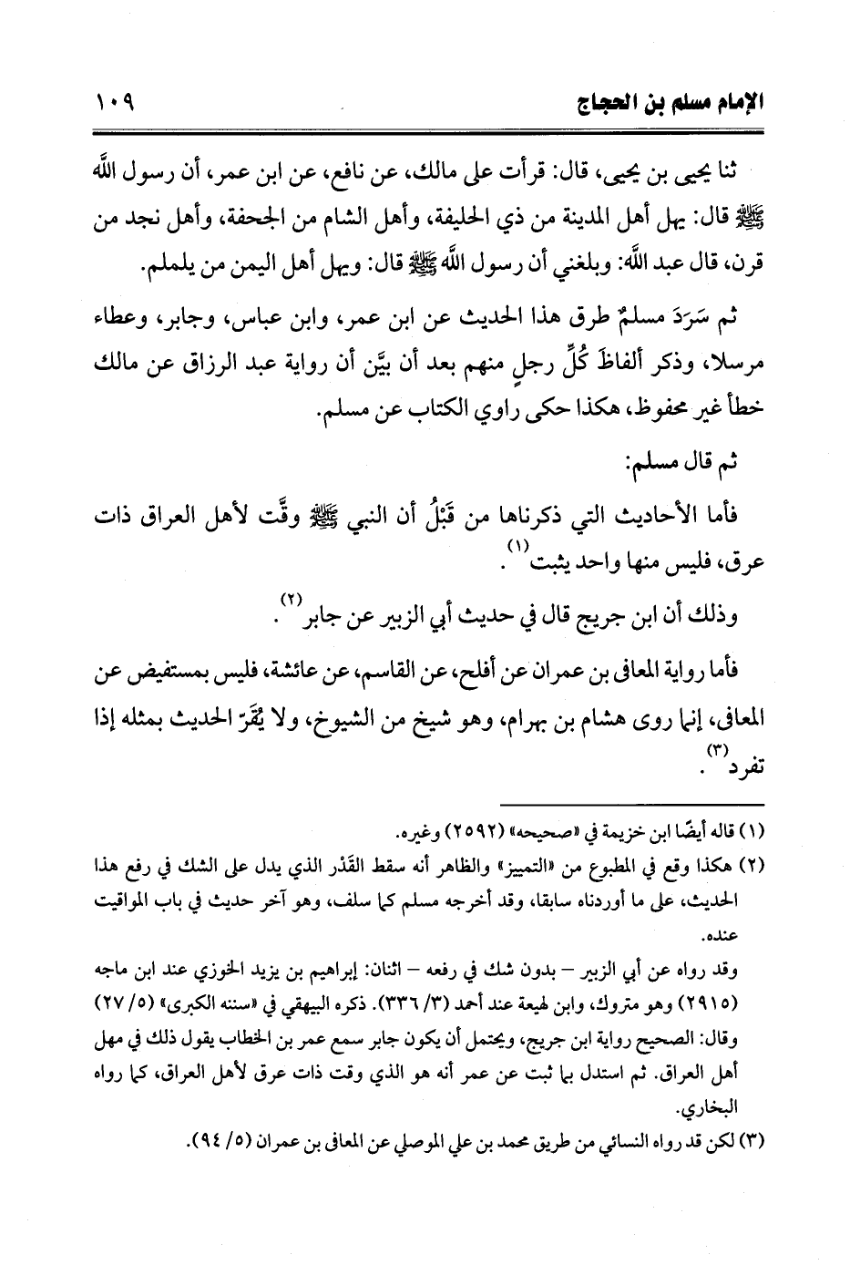ثنا يحيى بن يحيى، قال: قرأت على مالك، عن نافع، عن ابن عمر، أن رسول الله -صلى الله عليه وسلم- قال: يهل أهل المدينة من ذي الحليفة وأهل الشام من الجحفة، وأهل نجد من قرن، قال عبد الله: وبلغني أن رسول الله -صلى الله عليه وسلم- قال: ويهل أهل اليمن من يلملم.