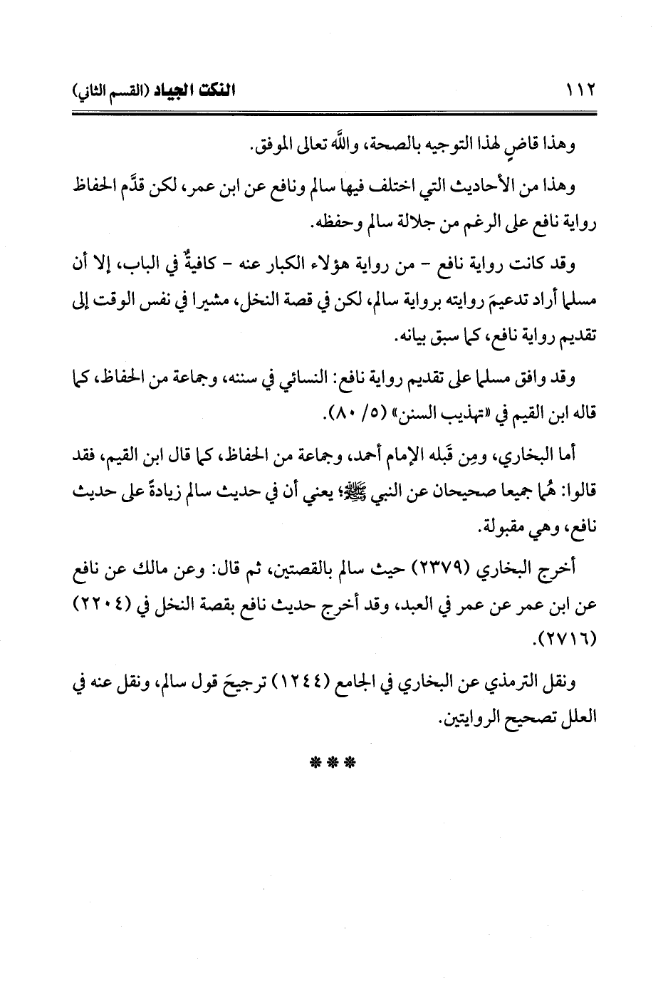 وقد كانت رواية نافع -من رواية هؤلاء الكبار عنه- كافيةٌ في الباب، إلا أن مسلما أراد تدعيمَ روايته برواية سالم، لكن في قصة النخل، مشيرا في نفس الوقت إلى تقديم رواية نافع، كما سبق بيانه.