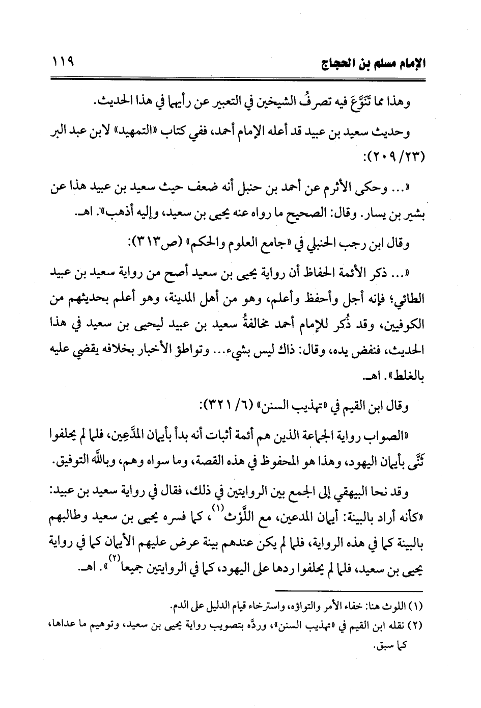 " ... ذكر الأئمة الحفاظ أن رواية يحيى بن سعيد أصح من رواية سعيد بن عبيد الطائي؛ فإنه أجل وأحفظ وأعلم، وهو من أهل المدينة وهو أعلم بحديثهم من الكوفيين، وقد ذُكر للإمام أحمد مخالفةُ سعيد بن عبيد ليحيى بن سعيد في هذا الحديث، فنفض، وقال: ذاك ليس بشيء ... وتواطؤ الأخبار بخلافه يقضي عليه بالغلط" اهـ.