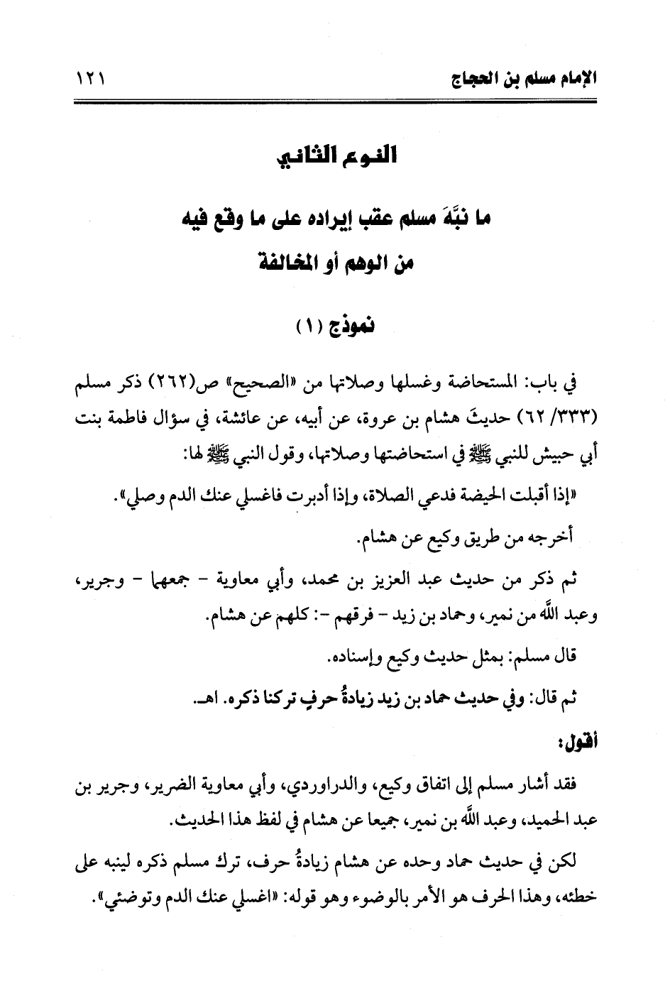 في باب: المستحاضة وغسلها وصلاتها من "الصحيح" ص (262) ذكر مسلم (333/ 62) حديثَ هشام بن عروة، عن أبيه، عن عائشة، في سؤال فاطمة بنت أبي حبيش للنبي -صلى الله عليه وسلم- في استحاضتها وصلاتها، وقول النبي -صلى الله عليه وسلم- لها: