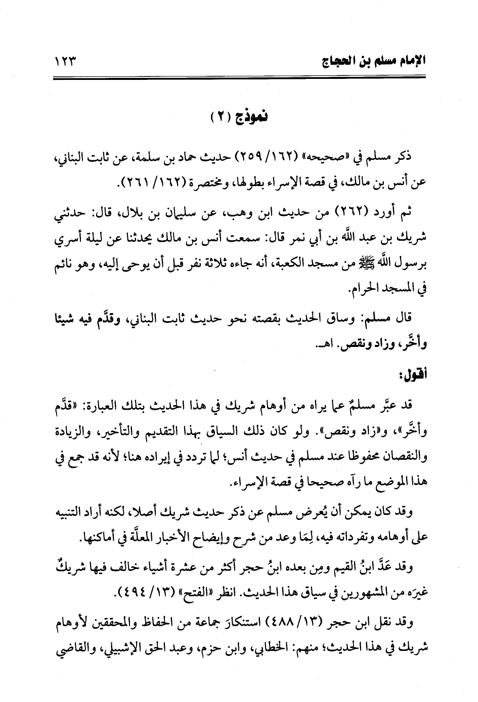 قد عبَّر مسلمٌ عما يراه من أوهام شريك في هذا الحديث بتلك العبارة: "قدَّم وأخَّر"، و"زاد ونقص". ولو كان ذلك السياق بهذا التقديم والتأخير، والزيادة والنقصان محفوظا عند مسلم في حديث أنس؛ لما تردد في إيراده هنا؛ لأنه قد جمع في هذا الموضع ما رآه صحيحا في قصة الإسراء.