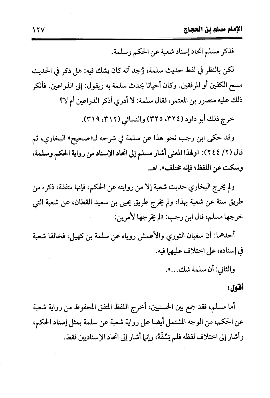 وقد حكى ابن رجب نحو هذا عن سلمة في شرحه لـ"صحيح" البخاري، ثم قال (2/ 244): "ولهذا المعنى أشار مسلم إلى اتحاد الإسناد من رواية الحكم وسلمة" وسكت عن اللفظ؛ فإنه مختلف". اهـ.