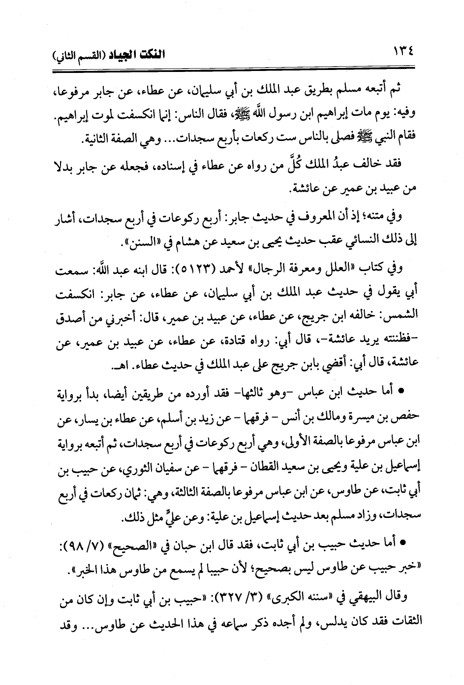 ثم أتبعه مسلم بطريق عبد الملك بن أبي سليمان، عن عطاء، عن جابر مرفوعا، وفيه: يوم مات إبراهيم ابن رسول الله -صلى الله عليه وسلم-، فقال الناس: إنما انكسفت لموت إبراهيم. فقام النبي -صلى الله عليه وسلم- فصلى بالناس ست ركعات بأربع سجدات ... وهي الصفة الثانية.