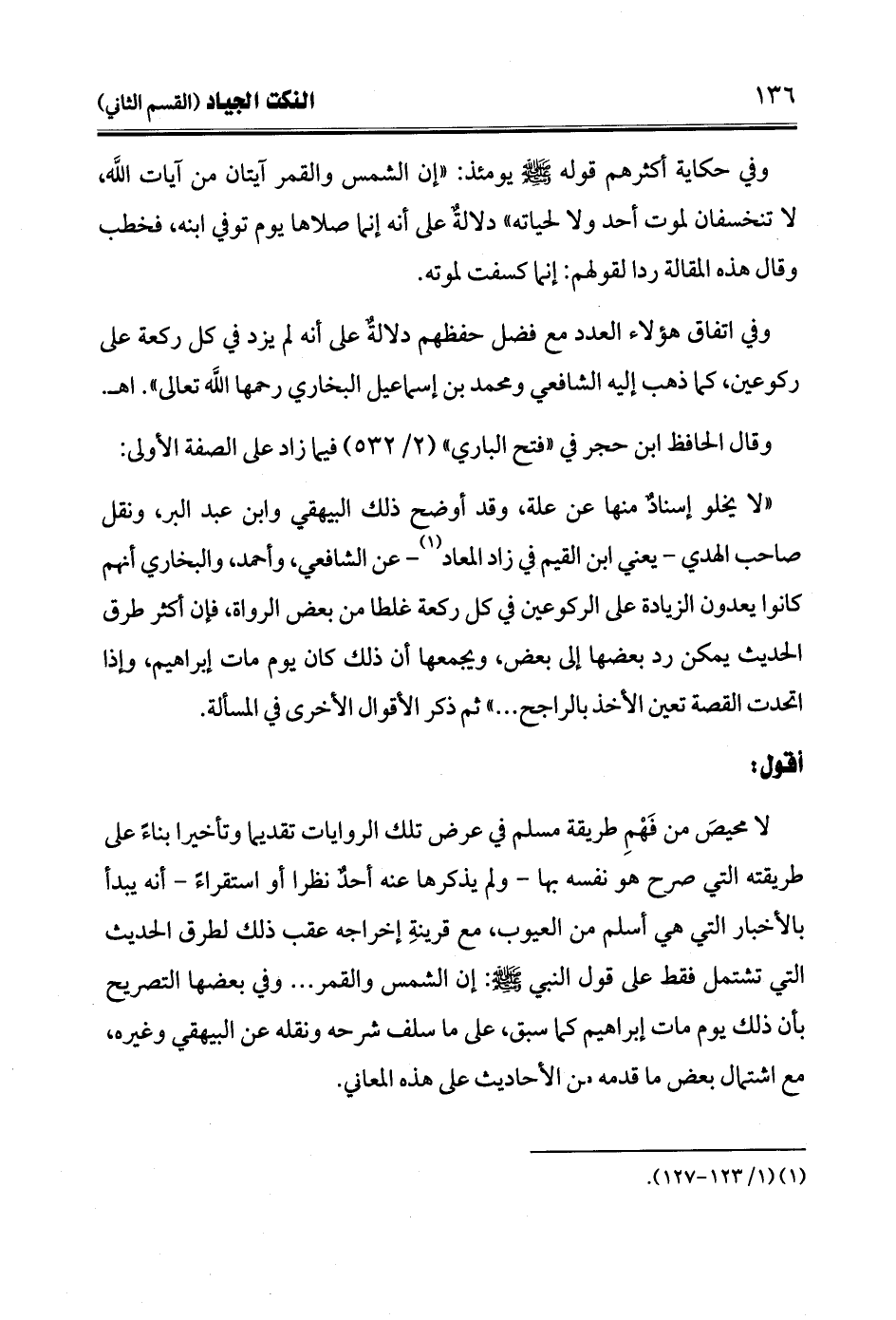 "لا يخلو إسنادٌ منها عن علة، وقد أوضح ذلك البيهقي وابن عبد البر، ونقل صاحب الهدي -يعني ابن القيم في زاد المعاد (¬1) - عن الشافعي، وأحمد، والبخاري أنهم كانوا يعدون الزيادة على الركوعين في كل ركعة غلطا من بعض الرواة، فإن أكثر طرق الحديث يمكن رد بعضها إلى بعض، ويجمعها أن ذلك كان يوم مات إبراهيم، وإذا اتحدت القصة تعين الأخذ بالراجح ... " ثم ذكر الأقوال الأخرى في المسألة.