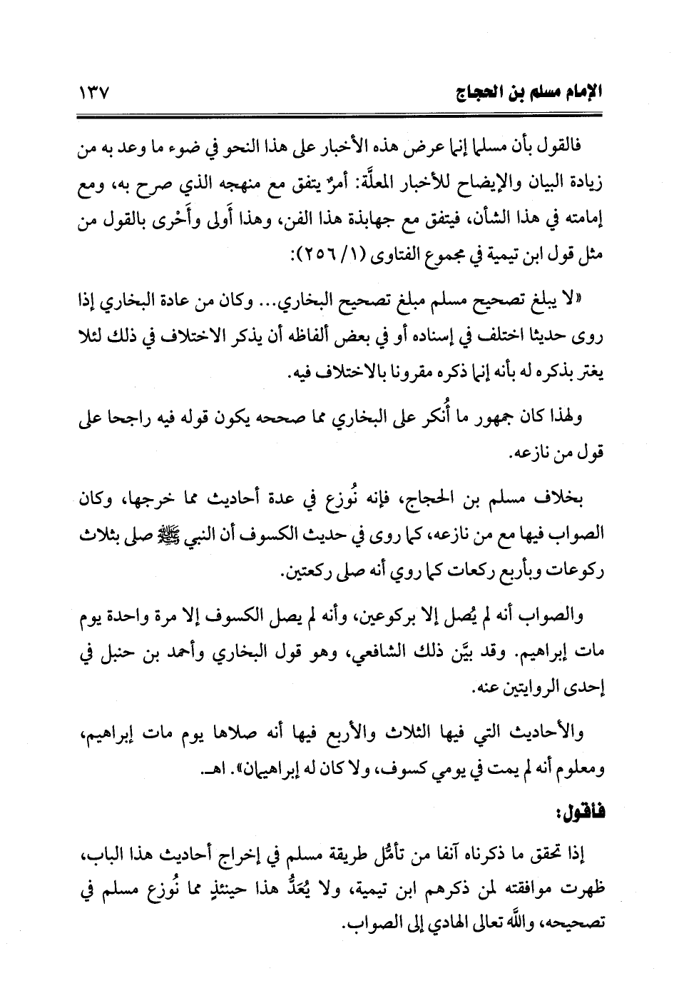 فالقول بأن مسلما إنما عرض هذه الأخبار على هذا النحو في ضوء ما وعد به من زيادة البيان والإيضاح للأخبار المعلَّة: أمرٌ يتفق مع منهجه الذي صرح به، ومع إمامته في هذا الشأن، فيتفق مع جهابذة هذا الفن، وهذا أَولى وأَحْرى بالقول من مثل قول ابن تيمية في مجموع الفتاوى (1/ 256):