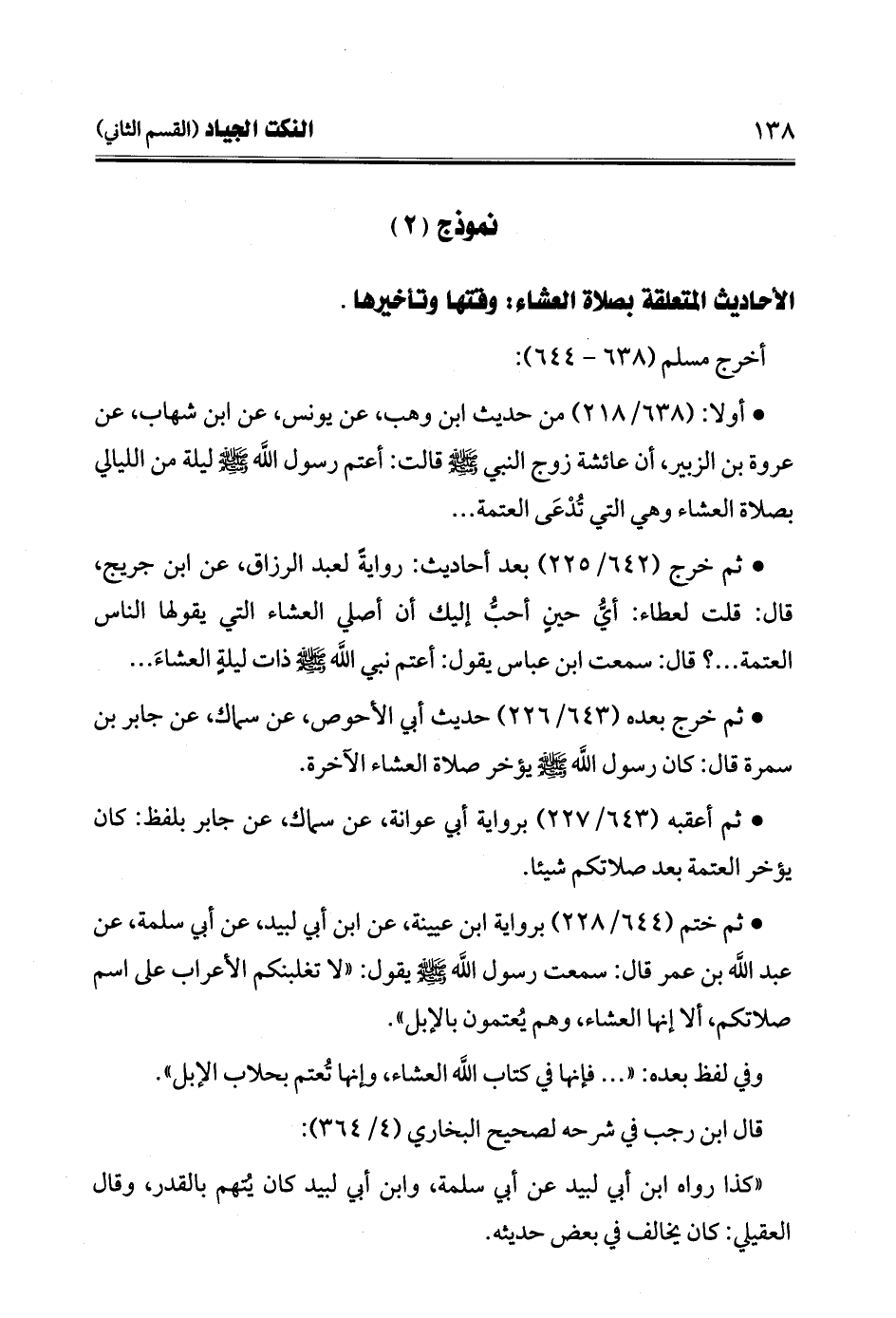 • ثم خرج بعده (643/ 226) حديث أبي الأحوص، عن سماك، عن جابر بن سمرة قال: كان رسول الله -صلى الله عليه وسلم- يؤخر صلاة العشاء الآخرة.