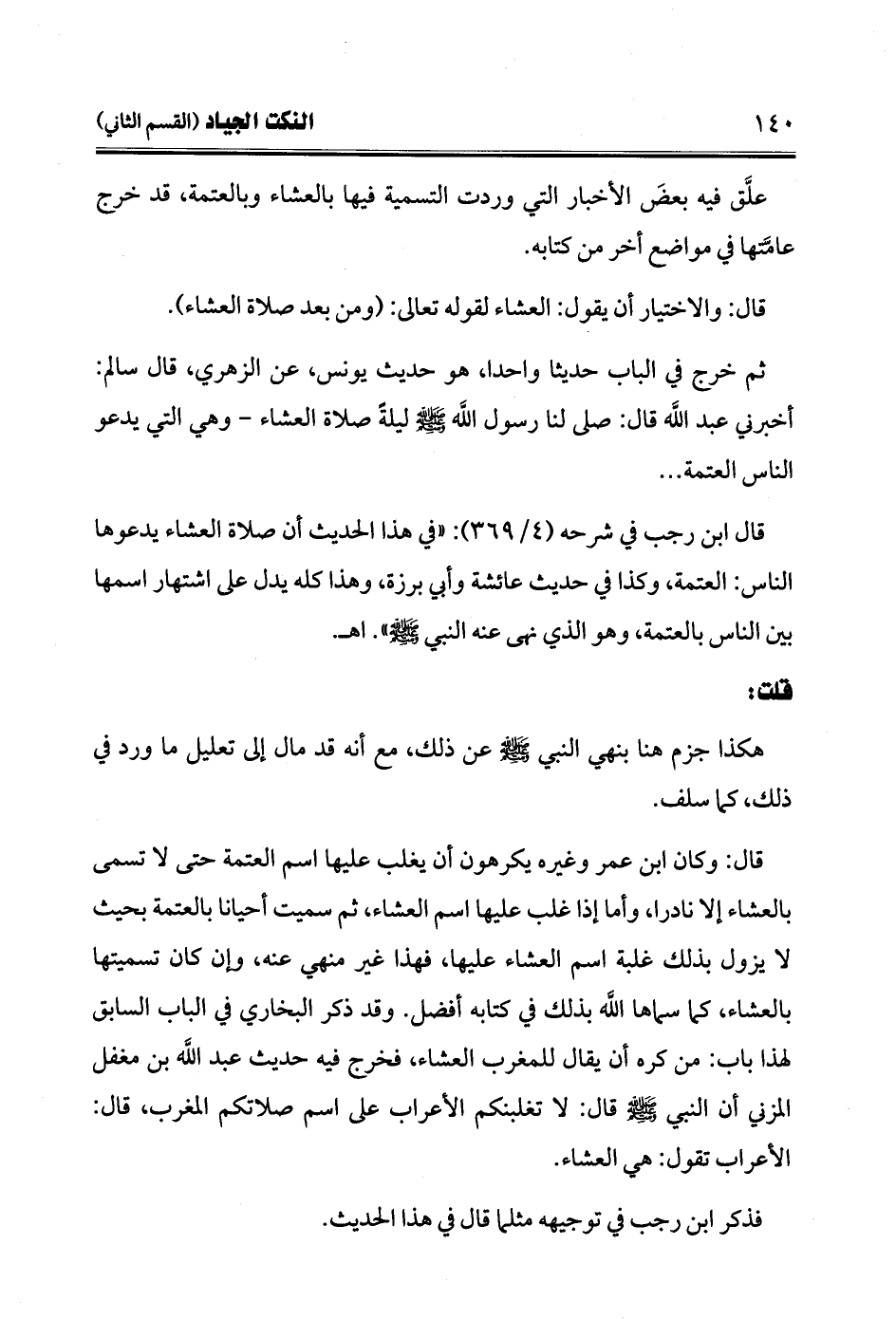 قال: وكان ابن عمر وغيره يكرهون أن يغلب عليها اسم العتمة حتى لا تسمى بالعشاء إلا نادرا، وأما إذا غلب عليها اسم العشاء، ثم سميت أحيانا بالعتمة بحيث لا يزول بذلك غلبة اسم العشاء عليها، فهذا غير منهي عنه، وإن كان تسميتها بالعشاء، كما سماها الله بذلك في كتابه أفضل. وقد ذكر البخاري في الباب السابق لهذا باب: من كره أن يقال للمغرب العشاء، فخرج فيه حديث عبد الله بن مغفل المزني أن النبي -صلى الله عليه وسلم- قال: لا تغلبنكم الأعراب على اسم صلاتكم المغرب، قال: الأعراب تقول: هي العشاء.