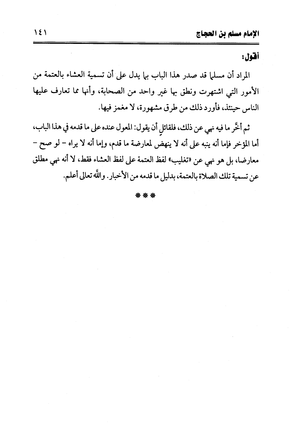 ثم أخَّر ما فيه نهي عن ذلك، فلقائلٍ أن يقول: المعول عنده على ما قدمه في هذا الباب، أما المؤخر فإما أنه ينبه على أنه لا ينهض لمعارضة ما قدم، وإما أنه لا يراه -لو صح- معارضا، بل هو نهي عن "تغليب" لفظ العتمة على لفظ العشاء فقط، لا أنه نهي مطلق عن تسمية تلك الصلاة بالعتمة، بدليل ما قدمه من الأخبار. والله تعالى أعلم.