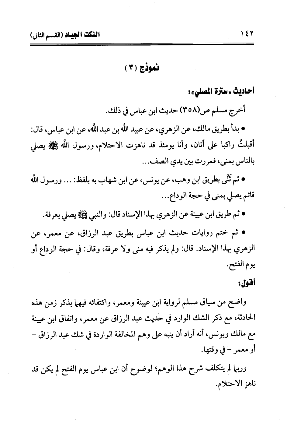 • بدأ بطريق مالك، عن الزهري، عن عبيد الله بن عبد الله، عن ابن عباس، قال: أقبلتُ راكبا على أتان، وأنا يومئذ قد ناهزت الاحتلام، ورسول الله -صلى الله عليه وسلم- يصلي بالناس بمنى، فمررت بين يدي الصف ...