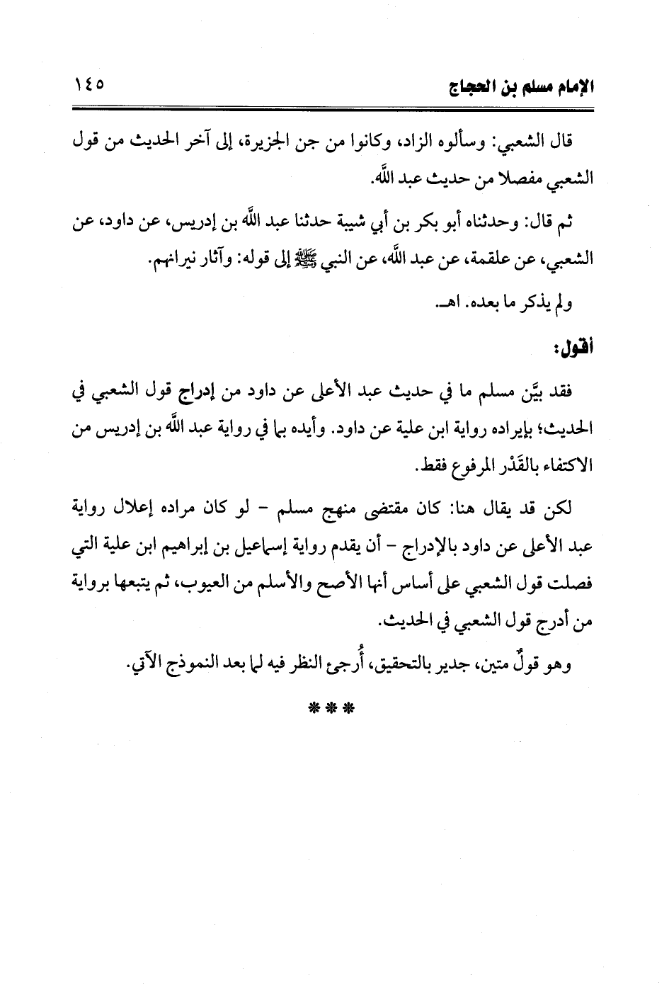 فقد بيَّن مسلم ما في حديث عبد الأعلى عن داود من إدراج قول الشعبي في الحديث؛ بإيراده رواية ابن علية عن داود. وأيده بما في رواية عبد الله بن إدريس من الاكتفاء بالقَدْر المرفوع فقط.