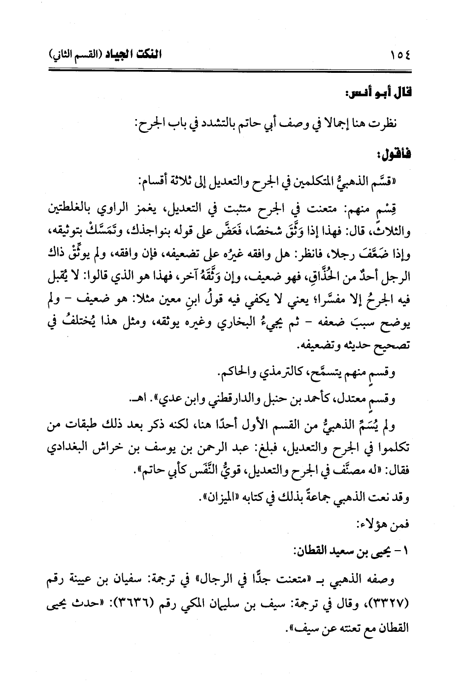 "قسَّم الذهبيُّ المتكلمين في الجرح والتعديل إلى ثلاثة أقسام: