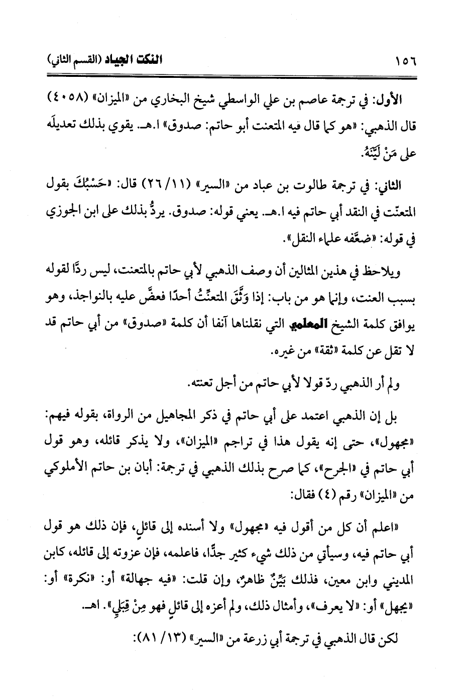 الثاني: في ترجمة طالوت بن عباد من "السير" (11/ 26) قال: "حَسْبُكَ بقول المتعنّت في النقد أبي حاتم فيه اهـ. يعني قوله: صدوق. يردُّ بذلك على ابن الجوزي في قوله: "ضعَّفه علماء النقل".