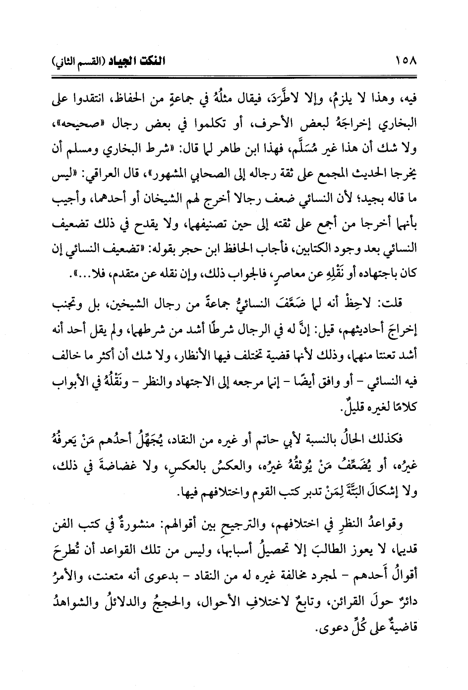 قلت: لاحِظْ أنه لما ضَعَّفَ النسائيُّ جماعةً من رجال الشيخين، بل وتجنب إخراجَ أحاديثهم، قيل: إنَّ له في الرجال شرطًا أشد من شرطهما، ولم يقل أحد أنه أشد تعنتا منهما، وذلك لأنها قضية تختلف فيها الأنظار، ولا شك أن أكثر ما خالف فيه النسائي -أو وافق أيضا- إنما مرجعه إلى الاجتهاد والنظر- ونَقْلُهُ في الأبواب كلامًا لغيره قليلٌ.