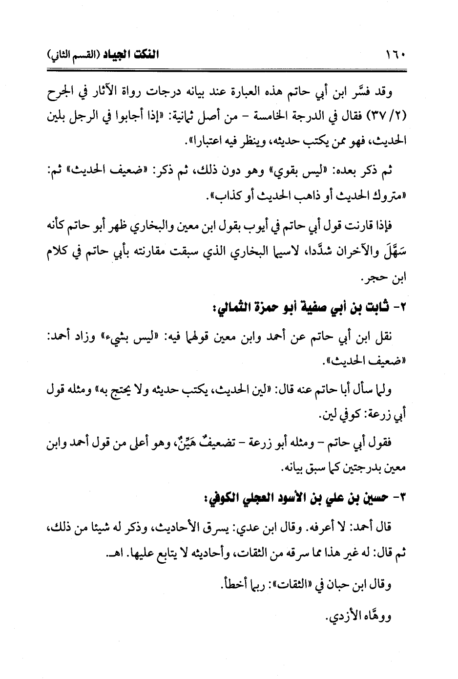 وقد فسَّر ابن أبي حاتم هذه العبارة عند بيانه درجات رواة الآثار في الجرح (2/ 37) فقال في الدرجة الخامسة - من أصل ثمانية: "إذا أجابوا في الرجل بلين الحديث، فهو ممن يكتب حديثه، وينظر فيه اعتبارا".