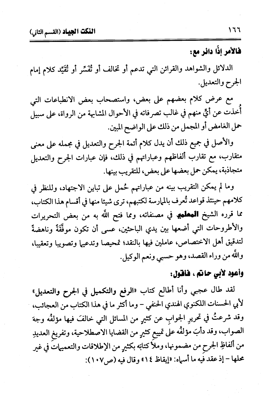 وما لم يمكن التقريب بينه من عباراتهم حُمل على تباين الاجتهاد، وللنظر في كلامهم حينئذ قواعد تُعرف بالممارسة لكتبهم، ترى شيئا منها في أقسام هذا الكتاب، مما قرره الشيخ المعلمي في مصنفاته، ومما فتح الله به من بعض التحريرات والأطروحات التي أضعها بين يدي الباحثن، عسى أن تكون موفَّقَةً وناهضةً لتدقيق أهل الاختصاص، عاملين فيها بالنقد؛ تمحيصا وتدعيما وتصويبا وتعقيبا، والله من وراء القصد، وهو حسبي ونعم الوكيل.