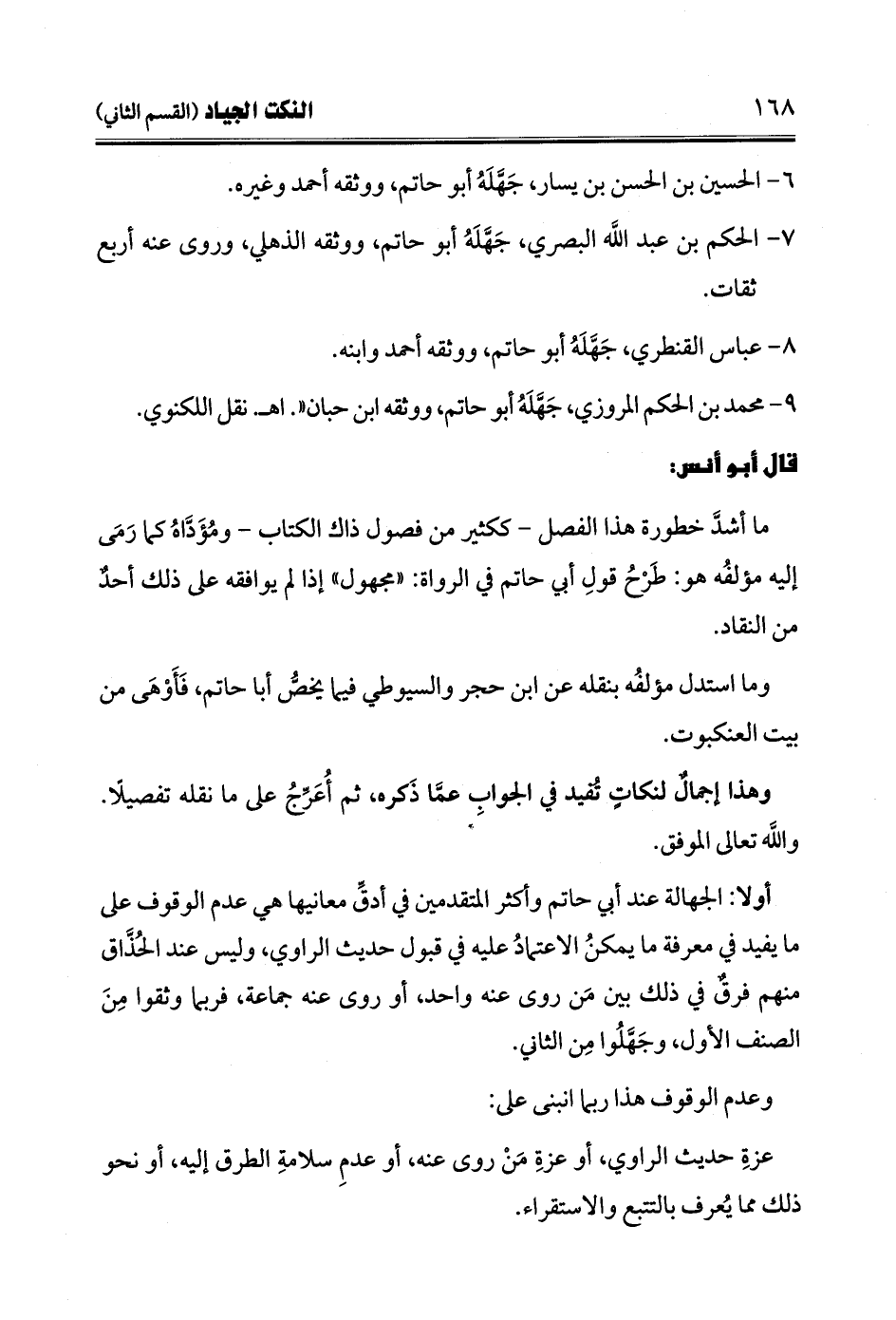ما أشدَّ خطورة هذا الفصل -ككثير من فصول ذاك الكتاب- ومُؤَدَّاهُ كما رَمَى إليه مؤلفُه هو: طَرْحُ قولِ أبي حاتم في الرواة: "مجهول" إذا لم يوافقه على ذلك أحدٌ من النقاد.