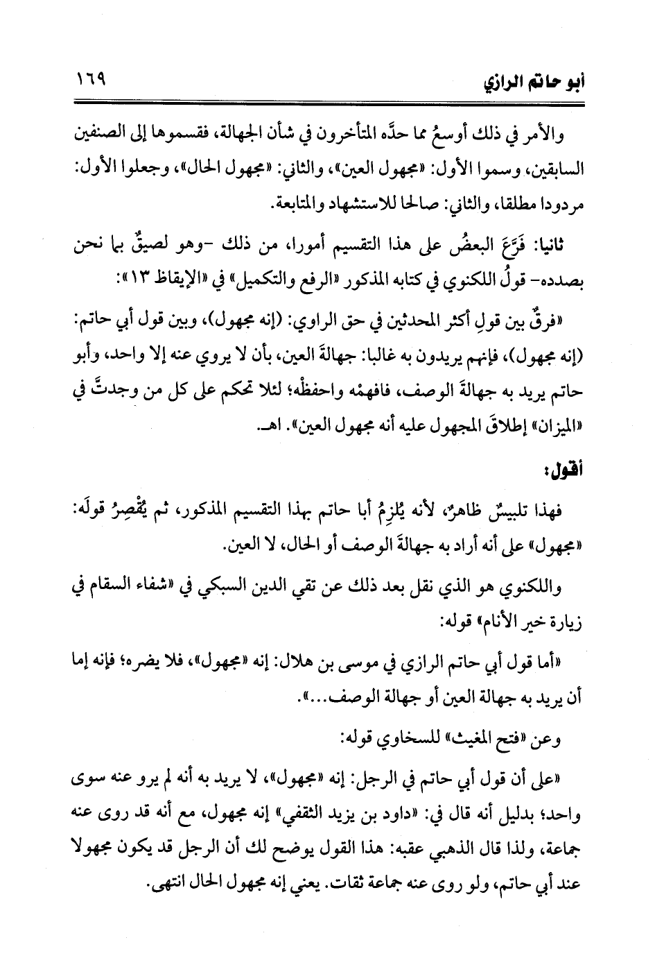 "على أن قول أبي حاتم في الرجل: إنه "مجهول"، لا يريد به أنه لم يرو عنه سوى واحد؛ بدليل أنه قال في: "داود بن يزيد الثقفي" إنه مجهول، مع أنه قد روى عنه جماعة، ولذا قال الذهبي عقبه: هذا القول يوضح لك أن الرجل قد يكون مجهولا عند أبي حاتم، ولو روى عنه جماعة ثقات. يعني إنه مجهول الحال انتهى.