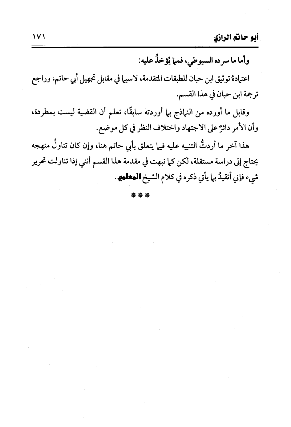 هذا آخر ما أردتُّ التنبيه عليه فيما يتعلق بأبي حاتم هنا، وإن كان تناولُ منهجه يحتاج إلى دراسة مستقلة، لكن كما نبهت في مقدمة هذا القسم أنني إذا تناولت تحرير شيء فإني أتقيدُ بما يأتي ذكره في كلام الشيخ المعلمي.