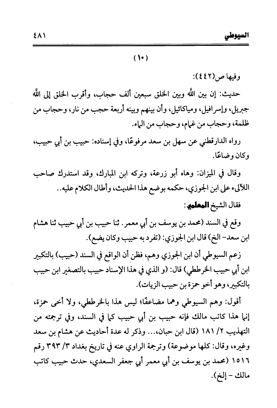 زعم السيوطي أن ابن الجوزي وهم، فظن أن الواقع في السند (حبيب) بالتكبير ابن أبي حبيب الخرططي) قال: (والذي في هذا الإسناد حبيب بالتصغير ابن حبيب بالتكبير، وهو أخو حمزة بن حبيب الزيات).
