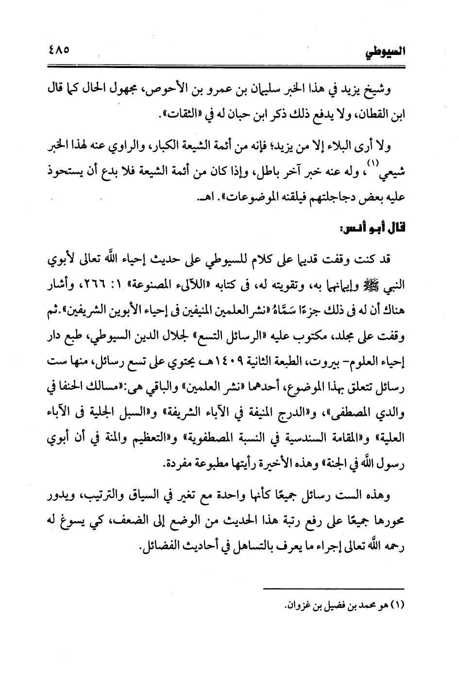 قد كنت وقفت قديمًا على كلام للسيوطي على حديث إحياء الله تعالى لأبوي النبي -صلى الله عليه وسلم- وإيمانهما به، وتقويته له، في كتابه "اللآلىء المصنوعة" 1: 266، وأشار هناك أن له في ذلك جزءًا سَمَّاهُ "نشر العلمين المنيفين في إحياء الأبوين الشريفين". ثم وقفت على مجلد، مكتوب عليه "الرسائل التسع" لجلال الدين السيوطي، طبع دار إحياء العلوم - بيروت، الطبعة الثانية 1409 هـ يحتوي على تسع رسائل، منها ست رسائل تتعلق بهذا الموضوع، أحدهما "نشر العلمين" والباقي هي: "مسالك الحنفا في والدي المصطفى"، و"الدرج المنيفة في الآباء الشريفة" و"السبل الجلية في الآباء العلية" و"المقامة السندسية في النسبة المصطفوية" و"التعظيم والمنة في أن أبوي رسول الله في الجنة" وهذه الأخيرة رأيتها مطبوعة مفردة.