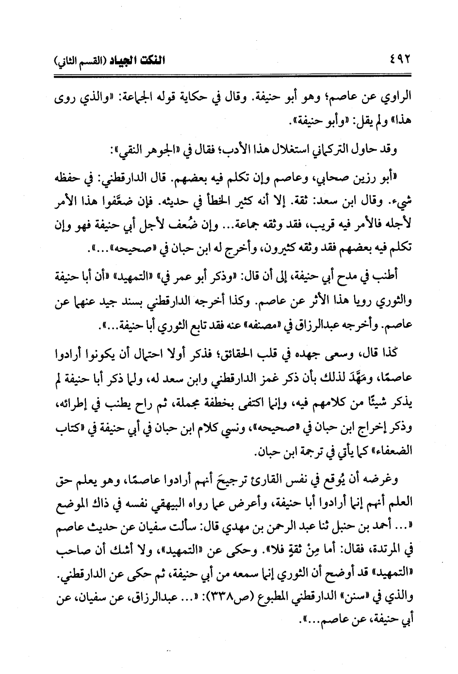 كذا قال، وسعى جهده في قلب الحقائق؛ فذكر أولا احتمال أن يكونوا أرادوا عاصمًا، ومَهَّدَ لذلك بأن ذكر غمز الدارقطني وابن سعد له، ولما ذكر أبا حنيفة لم يذكر شيئًا من كلامهم فيه، وإنما اكتفى بخطفه مجملة، ثم راح يطنب في إطرائه، وذكر إخراج ابن حبان في "صحيحه"، ونسي كلام ابن حبان في أبي حنيفة في "كتاب الضعفاء" كما يأتي في ترجمة ابن حبان.