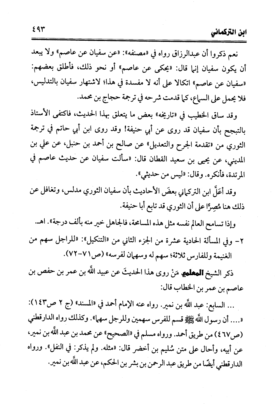 ... السابع: عبد الله بن نمير. رواه عنه الإمام أحمد في "المسند" (ج 2 ص 143): " .... أن رسول الله -صلى الله عليه وسلم- قسم للفرس سهمين وللرجل سهما". وكذلك رواه الدارقطني (ص 467) من طريق أحمد. ورواه مسلم في "الصحيح" عن محمد بن عبد الله بن نمير، عن أبيه، وأحال على متن سُليم بن أخضر قال: "مثله. ولم يذكر: في النفل". ورواه الدارقطني أيضًا من طريق عبد الرحمن بن بشر بن الحكم، عن عبد الله بن نمير.